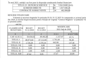 Volumul şi structura bugetului în perioada 01.01-31.12.2021 în comparație cu aceeași perioadă din 2020, la nivelul Inspectoratului pentru Situații de Urgență ”General Magheru” al județului Vâlcea, se prezintă astfel: