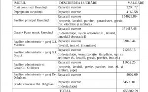 Au fost efectuate reparaţii curente la imobilele unităţii s-au executat conform precizărilor din I.M.I.R.A nr. 664/ 2008 cu modificările şi completările ulterioare, întocmindu-se documentaţiile tehnice de aprobare (Note de constatare, antemăsurători şi devize estimative) şi cele de execuţie (Procese-verbale de recepţie, situaţii de lucrări şi extrase de materiale) necesare executării lucrărilor de întreţinere conform normelor de deviz, în valoare de 655.882,59 lei, astfel: