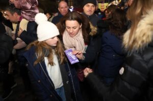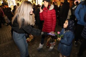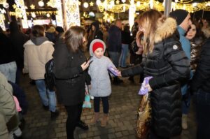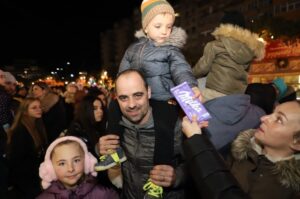 După aprinderea luminițelor, toti copiii prezenți la deschiderea Târgului de Crăciun au primit dulciuri din partea primariei.