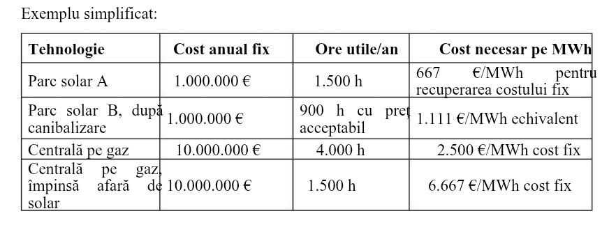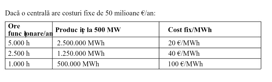 Centralele dispecerizabile au costuri fixe: personal, mentenanță, amortizare, taxe, capital, contracte de gaz, rezervă tehnică. Dacă funcționează mai puține ore, costul fix se împarte la mai puțini MWh produși, adică crește prețul în piață.